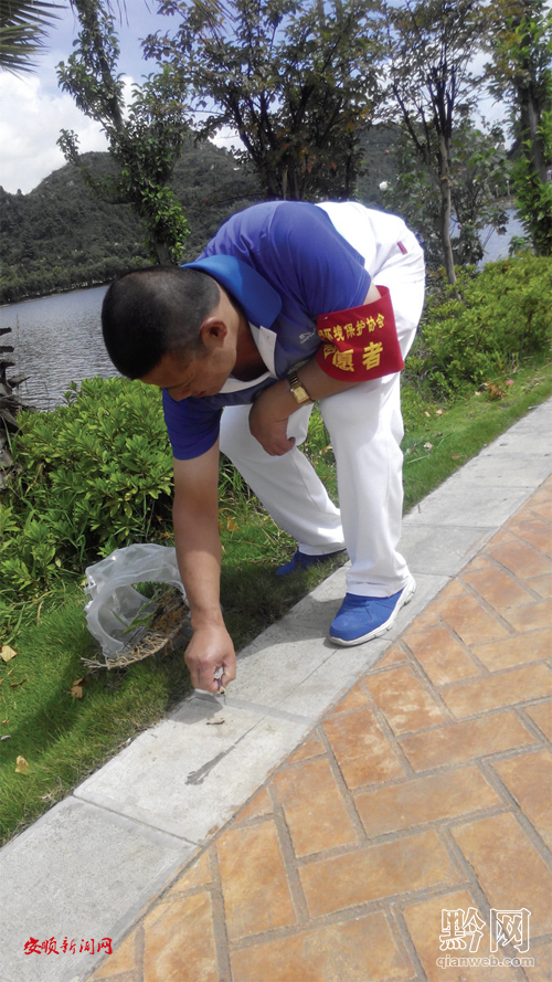 一位男志愿者直接用手在环湖路上捡起一个烟头