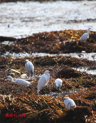 近日,在虹山湖畔,几十只白鹭在波光粼粼的水面游弋、觅食、嬉戏。