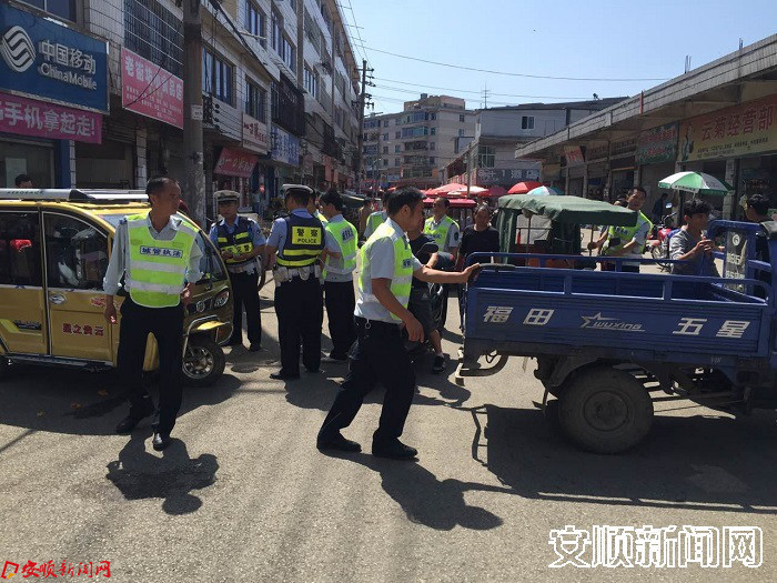 本网讯 为深入贯彻普定县人民政府“创建四创文明城市”及“多彩贵州、文明行动”等相关文件精神,5月10日,普定县公安局交警大队联合城管大队对长期盘踞在县城农贸市场内占道、乱停乱放、无牌无证的两轮、三轮摩托车进行集中整治。