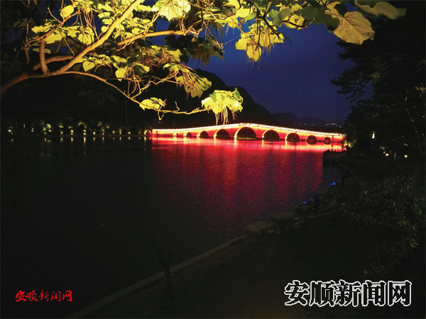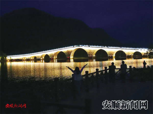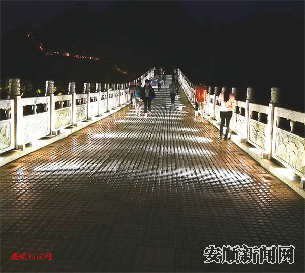 5月18日晚,记者来到九孔桥不远处,看见桥上美丽的灯光,桥下水面波光粼粼,在洗墙灯颜色的变幻下,水面显得如梦如幻,宛如霓裳,引来很多游人驻足观赏,纷纷拍照。记者走到九孔桥上,发现新增的过道灯反射到桥面上,人在光影中行走像一幅画,远远望去,的确很美。(黔中早报实习记者 武贵琼)