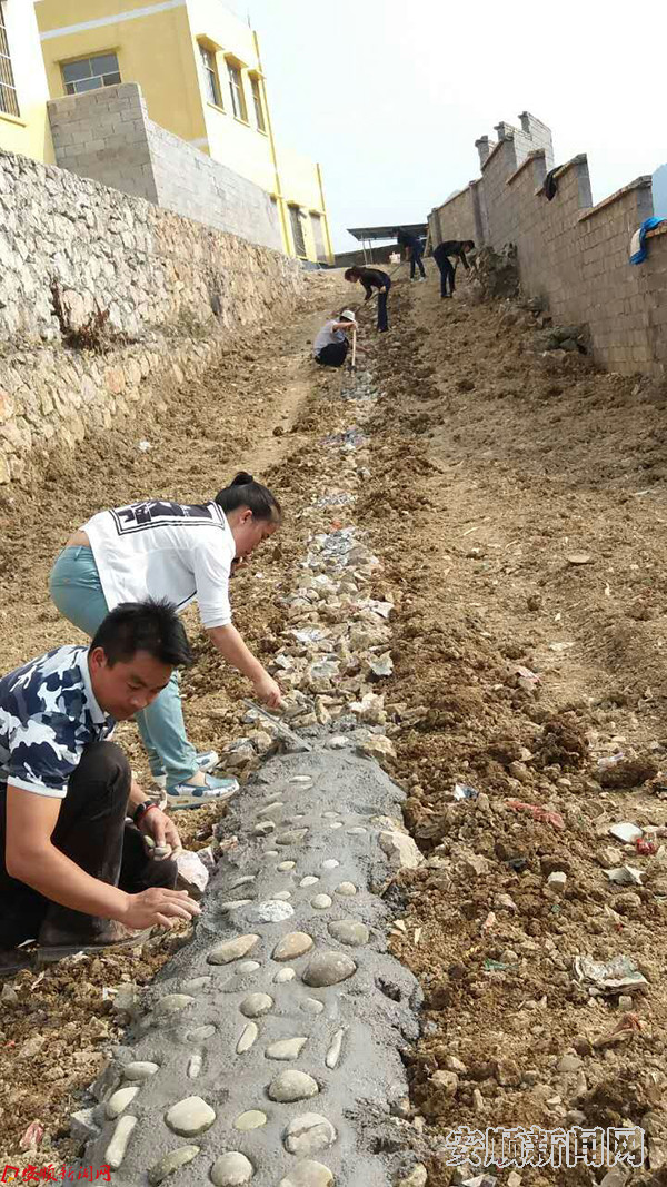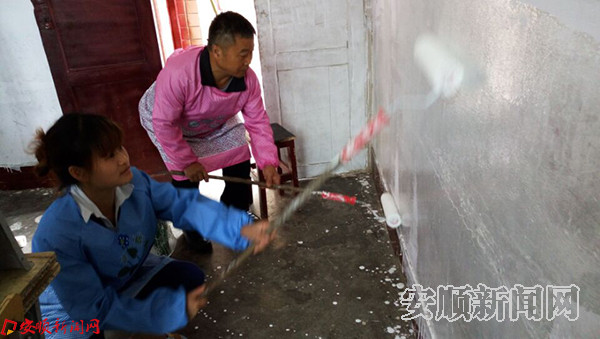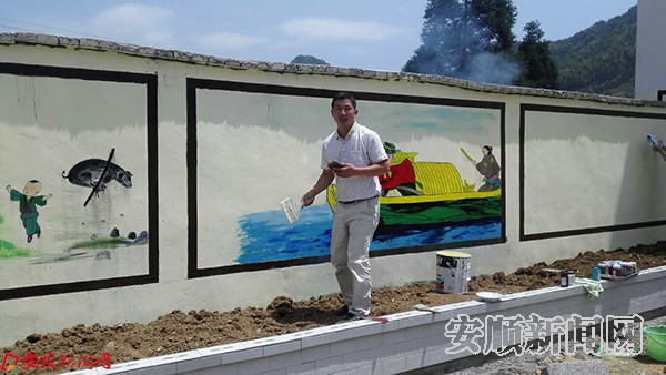 5月24日,紫云板当镇丙共小学的老师,认真地在学校的文化墙上绘出一幅幅精美的图画。这是紫云自治县各中小学开展“美在校园,百校争先”主题活动的一个画面。