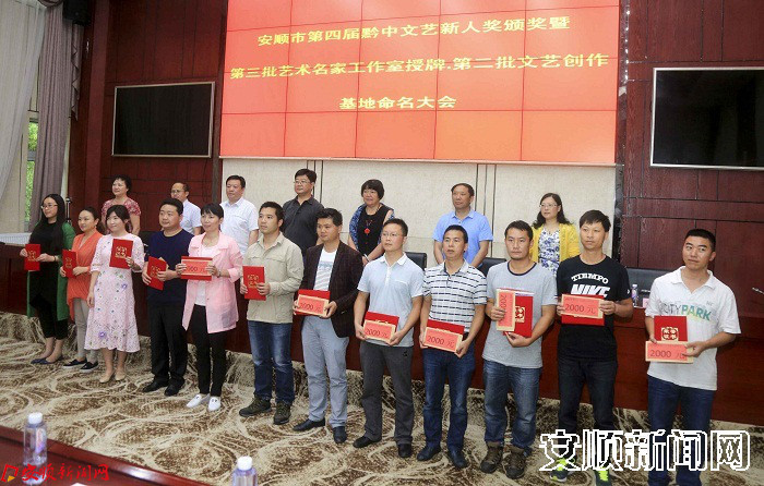 据悉,当天共有文学、美术、书法、摄影、民间文艺等艺术门类的14位45岁以下优秀中青年艺术家获2015年度“黔中文艺新人奖”。并对第三批21个“安顺市艺术名家工作室”进行了授牌。
