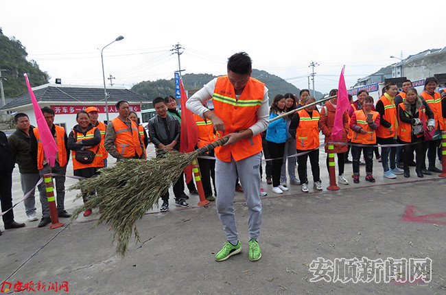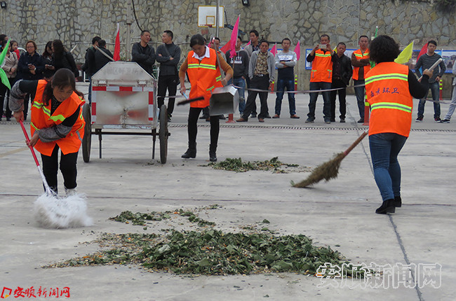 在位于小龙滩停车场的比赛现场,身着荧光橘色工作服的环卫工人们奋力角逐这场特殊的环卫“运动会”。据介绍,此次比赛项目都是结合环卫工人基本工作技能而设置,主要有扎扫把、清扫垃圾、拆装轮胎、吊垃圾斗、推板车等11个项目,分设一、二、三等奖。技能比赛均为集体项目,需要队员们相互协作、互相配合,靠团队合作意识取得佳绩。