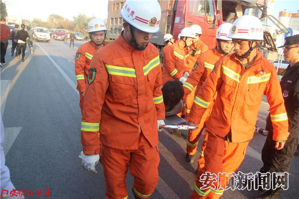 本网讯 11月20日16时33分,西秀区家喻五洲小区红绿灯处发生一起两辆货车追尾的交通事故,后车一名男性被困。西秀区消防大队特勤中队接到调度后立即赶赴现场处置。经过20分钟紧张救援,将被困男子成功救出。