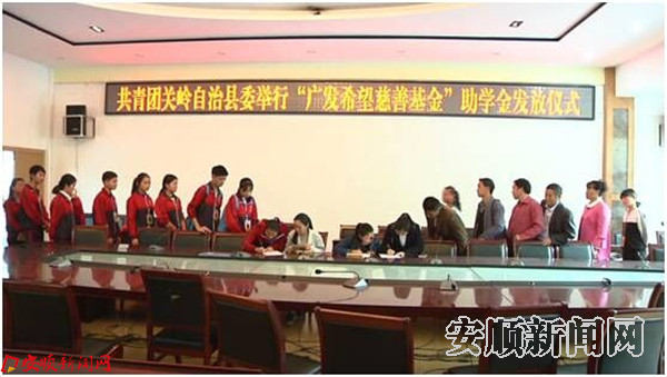 本网讯 为更好履行社会责任,帮助贫困学子完成学业。11月22日,共青团关岭自治县委在该县会议中心举行“广发希望慈善基金”助学发放仪式,当天来自关岭各中小学50名贫困学子喜获10万元资助。