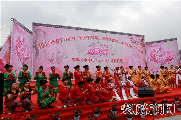 本网讯 3月6日下午,镇宁自治县在丁旗街道马鞍山社区开展“涵养好家风、滋养好作风、培育好民风”宣讲暨城乡巾帼庆“三八”联谊活动。安顺市妇联主席党组书记周蓉、县人大常委会副主任席德平、县政协副主席杨桂楠出席活动,县妇联六届执委、乡镇(街道)、机关企事业单位妇联负责人、及马鞍山社区群众500余人参加了活动。