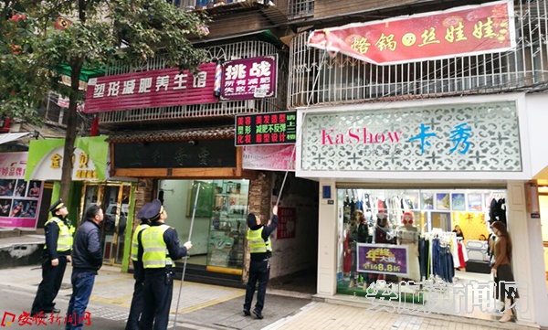 在对图书路夜市摊点整治过程中,城管执法人员对经营户私搭的电线进行了徒手清除,并对中华南路、图书路、宋官巷等二楼以上的商户擅自设置的布标、横幅进行了清理。在对北街进行整治时,发现尚存在少许餐饮商户未用新能源仍采用煤火经营,城管执法人员当即对其下达整改通知书,并规范餐饮商户严格按照前堂后灶标准经营,促使城区餐饮业经营秩序符合环保要求。