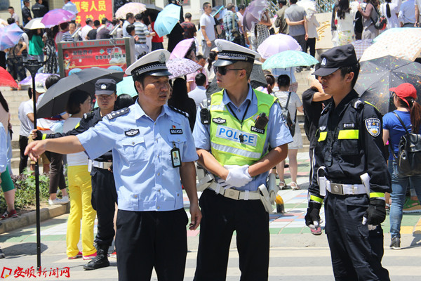 民警在新二中考点门口为高考考生保驾护航