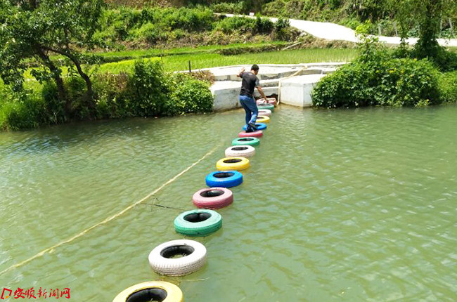 当日,记者在松山街道办主任李武伟的带路下走进枫香村,村子的多个路口两边都摆放着有粗钢管做柱子废旧轮胎作花盆的简易花桩,横穿枫村子的河道上新修了几道拦河坝,清澈水面上安装有吊桥、趣桥、栈桥、浮桥等,这些桥有的的绳子和模板搭成,有的是铁杆和木方搭成,有的是废弃轮胎和绳子搭成,既好玩又惊险。