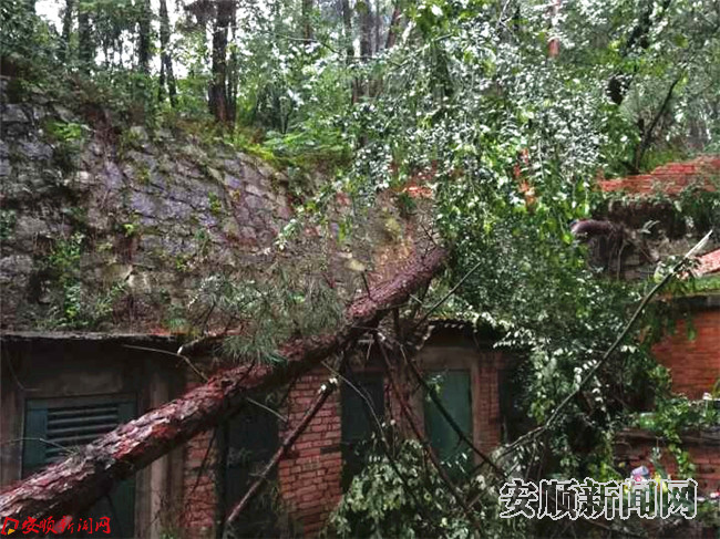 本网讯 平坝区安平街道黎阳一区1栋由于大雨导致山体滑坡两颗大树倒塌压倒围墙砸到一区五楼和一单元门前,平坝区安平街道办组织相关部门第一时间前往查看,组织相关人员疏散群众。(安顺日报社全媒体记者 陈斌)