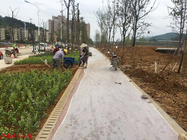 本网讯 7月6日, 雨后的空气格外清新,第七届新型城镇化现场观摩会时间临近,各个项目已进入收边扫尾阶段,记者来到高铁新城滨河景观项目施工现场看到,繁忙的工地上为城市建设的工人们有说有笑,一片城市和谐的景象,各种工程车、挖掘机正在作业,工人们正忙着为自行车道铺砖和绿化、亮化工作,都在为即将到来的第七届新型城镇化现场观摩会而默默贡献着自己的力量。