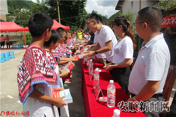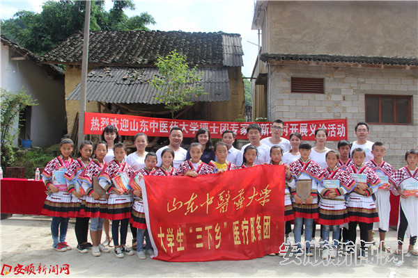苗族学生们穿着盛装,载歌载舞欢迎山东医药大学博士团的到来。捐赠仪式现场,山东中医药大学博士团的成员们为新驰小学的学生代表发放书籍。本次义诊捐赠活动山东中医药大学博士团捐赠10万元书籍,新驰村小学共200多名学生受益;捐赠17万元药品给乡卫生院,惠及全乡人民群众。