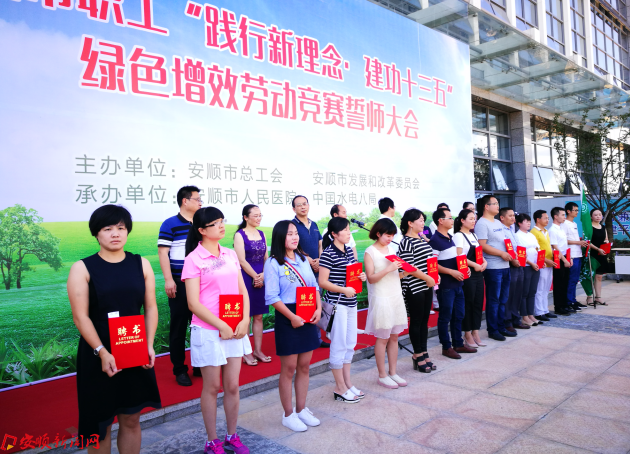 本网讯 7月26日,正值大暑,由安顺市总工会、安顺市发改委共同组办的职工“践行新理念·建功十三五”绿色增效劳动竞赛誓师大会在安顺市人民医院新院举行,来自全市各县区工会和发改系统的干部职工和相关企业职工参加了誓师大会。