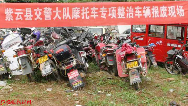 本网讯 8月9日上午,紫云自治县公安局交警大队在县恒盛修理厂对185台报废摩托车进行了集中销毁,部分群众现场观看了销毁过程,县电视台记者对销毁过程进行了全程报道。