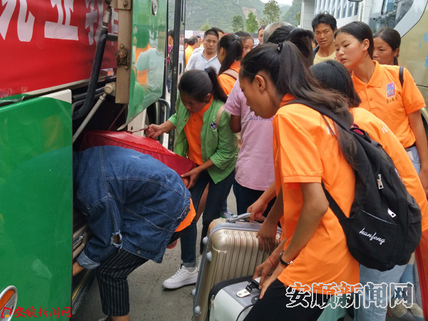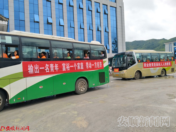 当天早上,紫云群众服务中心广场上聚集着拖着行李箱,胸前标有“紫云教育”、背上标有“精彩人生从此起航”字样上衣的学生。广场边上停放着四辆标有“家有万金,不如一技在身”字样的大客车。