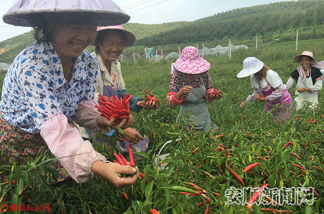 本网讯 距离安顺主城区60公里,紧邻平坝区的黄腊乡,从地图上看,被分成了上下两个区域,全乡辖7个村(居)56个自然村寨。近年来,该乡紧紧围绕脱贫攻坚,结合自身地理气候优势,积极调整农业产业结构,大力扶持各村发展产业助脱贫,在2015年实现了“减贫摘帽” ,全乡贫困发生率为3.21%。2016年农民人均可支配收入达到8340元。目前,黄腊乡现有龙头企业1家、较为成熟的合作社25家。建成了农业产业基地6170亩,共8种产业,其中菜单式扶贫试点的产业蔬菜种植达1450亩。8月23日,记者走进黄腊乡,放眼望去,绿油油的稻 田,青悠悠的山;葡萄园里,一串串熟透的葡萄躲在纸套袋里待人采摘;猕猴桃种植园里,整齐划一的架子上挂满了红心猕猴桃;而在那成片成片的辣椒地里最是热闹,烈日下一群妇女头戴帽子,有说有笑的采摘着辣椒,丰收的喜悦写在她们一张张笑脸上。