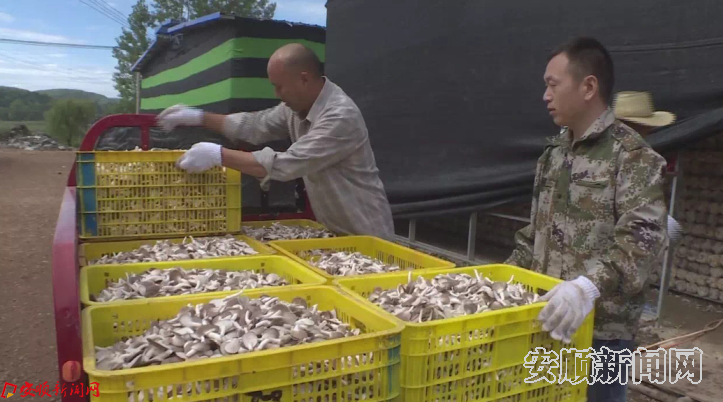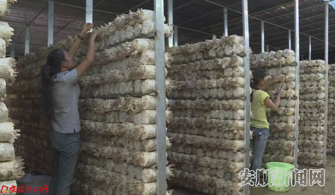 在关岭自治县关索街道办月亮湾村秀珍菇种植基地,菇香弥漫,密密麻麻捆扎结实、排放整齐的菌包上长满了一朵朵表面光洁、细嫩、厚实的秀珍菇。基地的工人们正忙着采摘、包装秀珍菇。