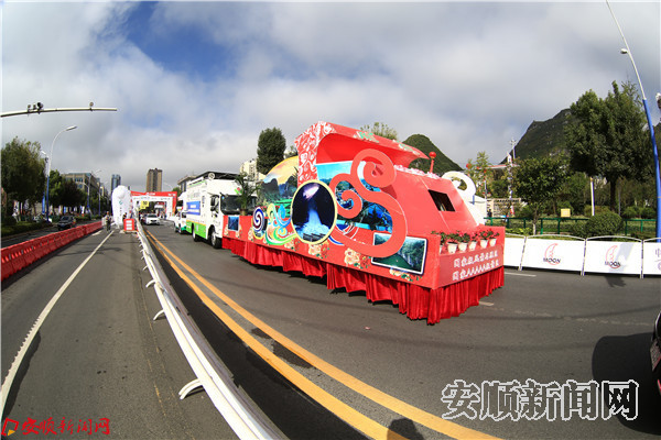 本网讯 9月17日,2017环中国国际公路自行车赛?安顺赛段正式开赛前,从西秀区驼宝山广场前赛道向东开始了花车开道巡游和荣誉骑行活动,行驶全程3.8公里。