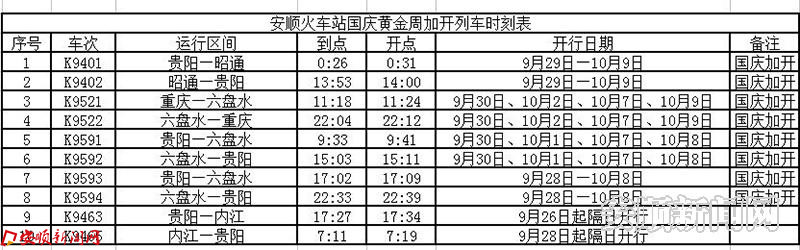 本网讯 昨日,记者从安顺火车站了解到,国庆期间安顺火车站将加开10列列车,市民可以通过12306网站、车站窗口、电话订票、代售点购买加开列车车票。
