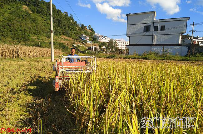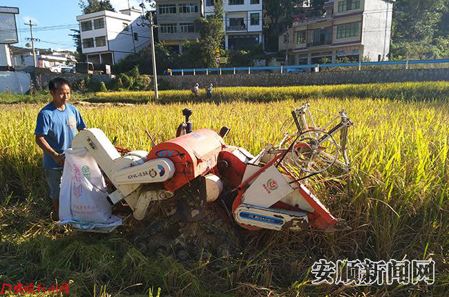 9月27日,记在紫云自治县格凸河镇沙戈村纳都组看到,田坝稻田里不少村民正在收割稻谷,不同的是,今年该村村民们用微型收割机取代了以往的人工打谷的收割方式。“一人操作一台微型收割机一天能收割7000斤,以往人工收割6人一组只能收割1000斤。”正在稻田里操作微型收割机的纳都组村民王小麻说。(安顺日报社全媒体记者 姚福进)