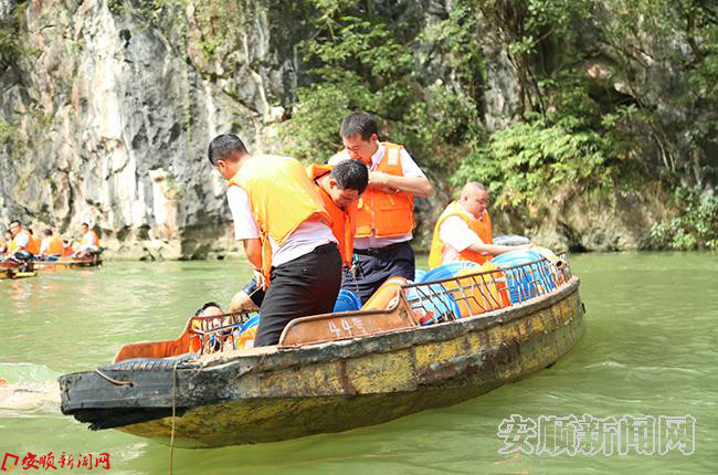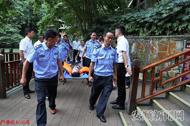 下午3点,在龙宫天池景点,工作人员进行游客落水应急演练。现场,由景区工作人员扮演的“游客”因起立拍照,在船员多次提醒无果后,不慎落水。事件突发,船员冷静分析,迅速反应,先安抚落水“游客”并提醒其抓紧救生衣,同时观察周围环境,对来往船只发出警告避免二次伤害,天池乘船码头接警后立即进行分工组织救援,现场工作人员维持秩序,安抚码头游客情绪,救援小组立即带上救生圈等救援工具驾船赶赴出事水域下水救援。实施救生、救援后,返航途中模拟落水者出现昏迷症状,紧急将落水“游客”运送至码头医疗处,医疗组先检查“游客”情况,做出判断后立刻实施人工呼吸,直至游客苏醒,然后使用救护车将其安全运送至医院,由医生对其进行全面救治与检查。
