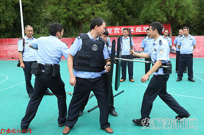当日上午9点,景区安全保卫部在龙宫公安派出所接受反恐培训,随后进行反恐演习。景区安保人员在警察同志的专业培训下,专业技能进一步提升,了解、熟悉防暴盾牌、防暴头盔、防暴钢叉等工具的使用,充实一线装备,保障旅客平安出行。演习现场,模拟“暴恐分子”带刀袭击群众,龙宫公安派出所警察、景区安保人员快速反应使用盾牌、钢叉等装备将“嫌疑人”制服。整场演练活动预案完善,演习人员反应迅速、处置果断、结果圆满,通过演练进一步提升了景区应对重大突发案事件的能力。
