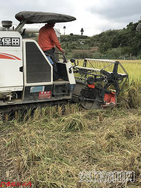 本网讯 微风送稻香,含笑频点头。眼下正是水稻收获的季节,金灿灿的稻穗在风中摇曳,传递着丰收的喜悦。白云、羊昌等各乡镇水稻主产区随处可见收获的忙碌场面。9月28日,记者在羊昌乡昌河村看到,一台台收割机正在连片的稻田里来回穿梭,农户们拿着蛇皮袋在自家的田埂上,等收割机装满一车稻谷,就将稻谷装袋运走,整个现代化收割过程一气呵成。