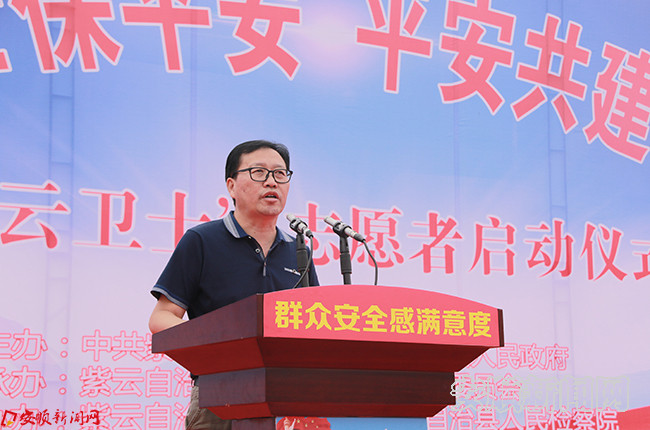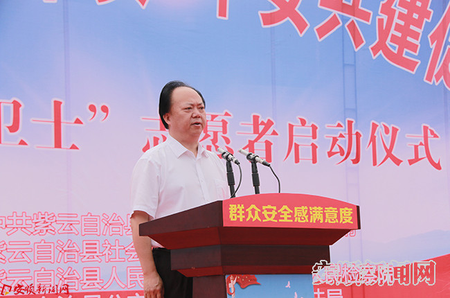 10:09【王永胜】同志们:今天,我们在这里隆重举行全县九月综治宣传月文艺演出暨“紫云卫士”志愿者启动仪式宣传活动,目的是为动员全县广大干部群众积极参与到“紫云卫士”志愿者和“平安紫云”建设活动中来,为全县政治安定、社会稳定、群众安居乐业打下坚实基础,为党的十九大胜利召开营造良好的社会环境和法制环境,打造“平安紫云、和谐紫云”新名片。