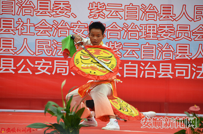 10:23【主持人】“平安紫云”建设工作中,有一项主要的内容,就是“平安校园”建设,紫云文艺学校积极响应县委、县政府的号召,把“平安校园”建设工作纳入学校重心工作当中,通过“小手拉大手、共建平安校园”为载体,从我做起、带动家庭、辐射社会,积极参与到全县平安建设工作中来。下面,请大家欣赏由平安校园--紫云文艺学校的同学们为大家带来的的武术表演《中华少年》。