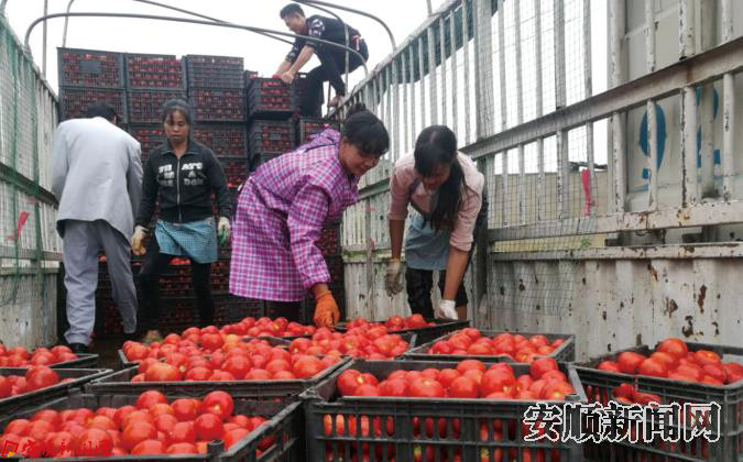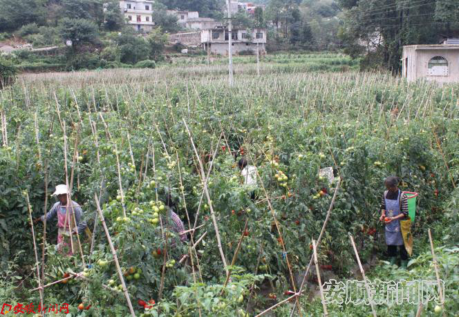 刚走进大桥村,一辆卡车在路边停放着,西红柿种植地里人头攒动,七八名村民忙着采摘西红柿,大家说说笑笑,干得起劲。“这里的西红柿产量高,品质好,我这次打算拉12吨到凯里销售,再有几个小时就能装车完毕。”车主陈学祥告诉记者。