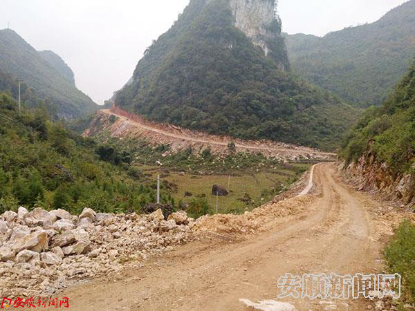 沿冗里组通组毛坯路步行1个多小时,便到山上从坝寨村通往旁如村的通村毛坯公路了。从通村毛坯路往旁如村委会方向看去,一条在岩山开凿出来的通村毛坯公路在麻山山脉上蜿蜒盘旋。