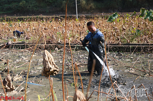 本网讯 近日,记者来到普定县化处镇水井村,不见了盛开的千亩荷花,取而代之的是一个个莲蓬散落在荷塘中,在一处荷塘中,七八个村民正在抓紧采挖莲藕,脸上是藏不住的收获的笑容,一幅丰收画面呈现在眼前。