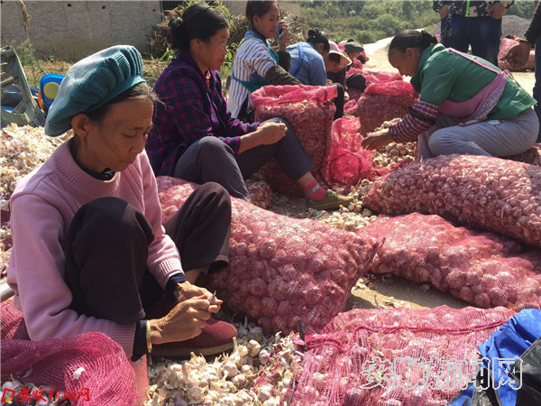 在后寨村头,一群村民分头坐在路边有说有笑,手里不停闲的剥着蒜种,每个人面前都堆满了剥好的大蒜瓣。一天干下来,动作快的村民能有一百多元的收入。