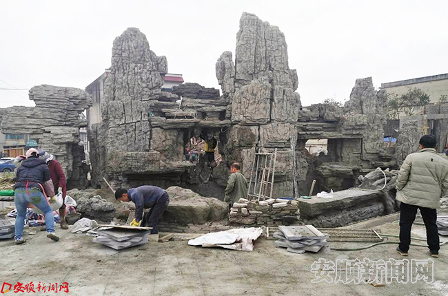 本网讯 12月14日,记者在开发区幺铺镇犇牛广场项目点看到,广场建设已初具雏形,地板石材铺装、背景墙、浮雕、假山等建设工程已基本完成,工人们正在进行亮化施工。