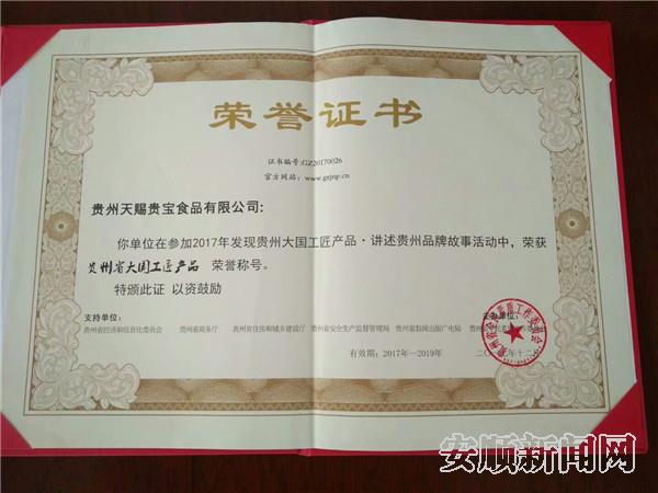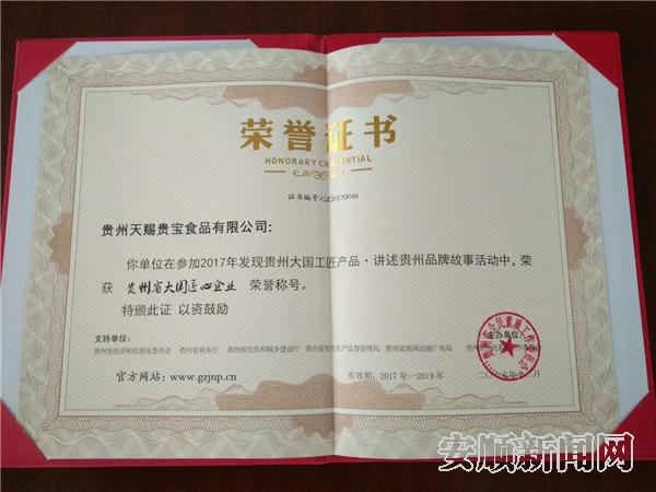本网讯 近日,记者在开发区相关部门了解到,贵州天赐贵宝食品有限公司在贵州省全民素质工作委员会主办的“发现贵州大国工匠产品·讲述贵州品牌故事”活动中,荣获“2017贵州省大国工匠产品”“2017贵州省大国匠心企业”荣誉称号。