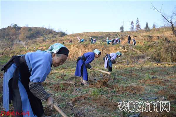 本网讯 近日,记者走进西秀区旧州镇猛龙村,在冬日暖阳照射下,记者看到大片坡耕地种上了楠竹,几十名穿着屯堡服饰的当地村民正在山上忙着栽种楠竹,一派繁忙景象。