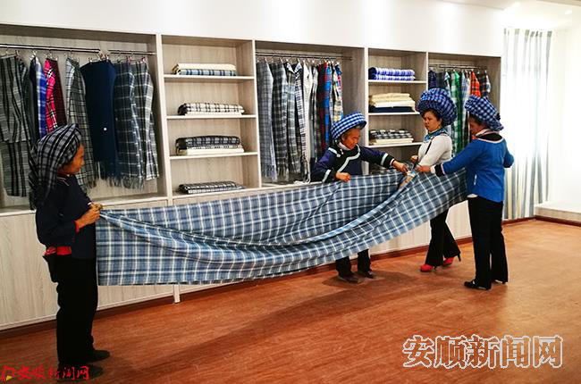 在贵州纯然布艺工艺品有限公司的厂房内,来自新铺镇巴茅村51岁的技术骨干周艺兰忙里忙外,公司大年初四就开了门,过年前培训过的许多妇女找上门来要活干,周艺兰一边给巴茅村的陈天茂、陆正琼取加工用的材料,一边叮嘱要按公司的花样织,有技术困难还会上门帮助。周艺兰心灵手巧,到纯然布艺公司上班已2年,经过努力成为公司的技术骨干,她感叹道:“以前在家务农,一年干到头总收入才七八千元,如今到企业上班,每月3600元,收入是过去的几倍,没想到指尖技术能够变成钱,还能帮助更多人脱贫,居家妇女找到了一条致富出路了。”在关岭自治县的布依族寨子里,古朴的布依族“格子花”布艺成为妇女脱贫致富的“宝贝”和妇女增收的“副业”。