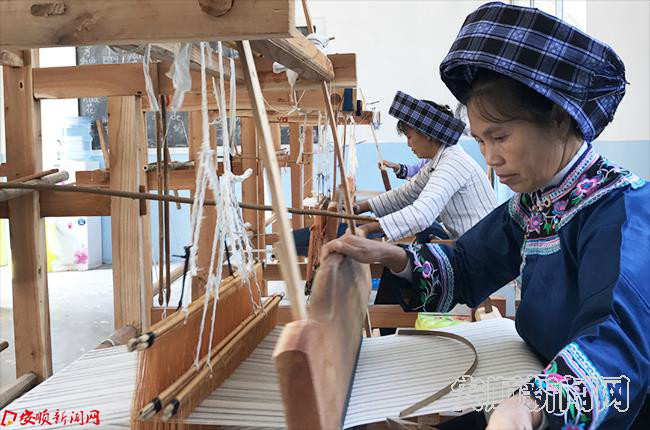 本网讯 2月27日,惠风和畅,关岭自治县上关镇红星村贵州依山源民族布艺贸易有限公司的织布车间里,有的正在纺线、有的正在织布,织布机涮涮涮的声音,伴随着女工们张驰有度的节奏,在春日暖阳下,一幅静动相宜的劳动画卷展现在记者眼前。