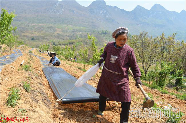 春暖花开,阳光明媚,3月20日,踏着春日的阳光走进关岭自治县断桥镇德新村果蔬种植基地,一片片坡地上种满了蜂糖李,在一棵棵蜂糖李树下,几十个村民正忙着铺盖地膜、除草等,一幅繁忙有序、生机勃勃的春耕图尽显眼前。
