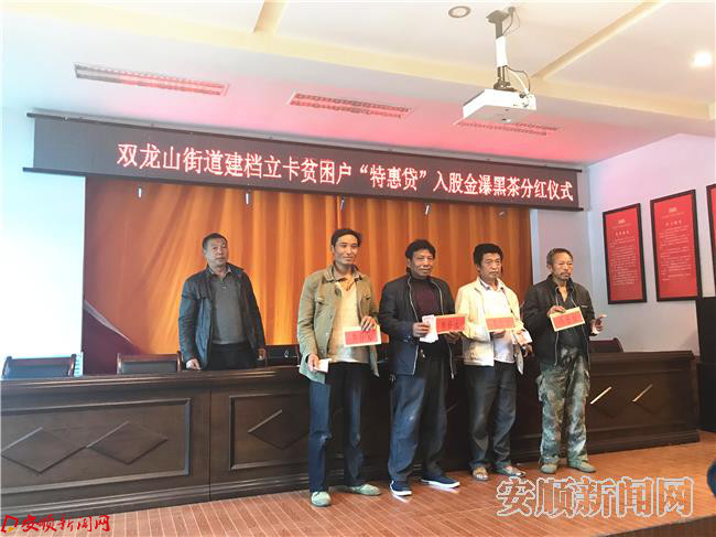 本网讯 4月20日,镇宁自治县双龙山街道举行建档立卡贫困户“特惠贷”入股金瀑黑茶分红仪式。入股金瀑黑茶的贫困户领到了2018年的入股分红。