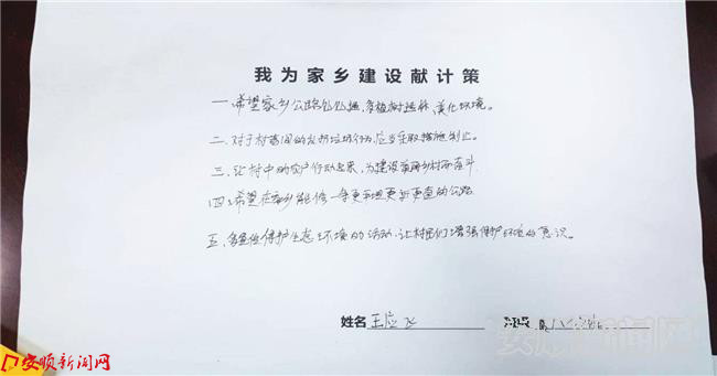 活动现场,由板当镇扶贫办负责人为学生们讲解脱贫攻坚知识及政策并号召学生们在假期参与到脱贫攻坚中,参与到父母的产业上,了解家庭脱贫产业,帮助家庭脱贫;之后举行了“我为家乡建设献计策”活动,活动现场气氛热烈,每位学生都积极的参与到活动当中,写出了自己的心声,其中八一班学生,王应飞写到“让村中的农户行动起来,为建设美丽乡村而奋斗。”