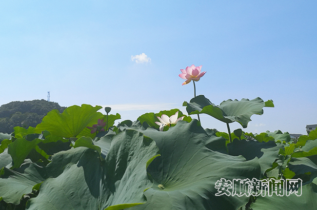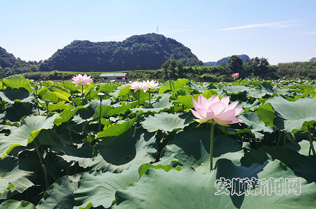 8月20日,笔者在普定县化处镇水井村看到,千亩荷花已盛开,蓝天白云下景色美不胜收,静待游客观赏。近年来,该村按照“茶果上山、蔬菜下地、莲藕进田”的产业结构调整发展思路,通过“村企合一”的组建模式,引进鄂莲系列、泰国莲等多个品种,扩大莲藕种植面积,全村目前发展莲藕种植1000余亩。通过农企销售、农超销售、电商销售、网络销售四大产销对接模式,2018年共销售商品藕、藕种、荷叶茶累计300余万元,带动种植户增收60余万元,带动村民务工增收70余万元,为168户贫困户分红累计达40余万元。(代娜 摄)