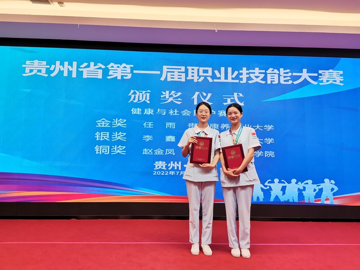 7月19日,安顺职院参赛选手赵金凤同学在贵州省第一届职业技能大赛“健康与社会照护”项目中荣获铜奖(左一);选手李浪同学荣获优胜奖(右一) 。