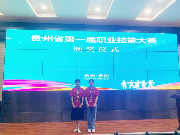 7月19日,贵州省第一届职业技能大赛安顺首金诞生,来自安顺技工学校选手吕甜甜(左一)获得酒店服务项目金牌。