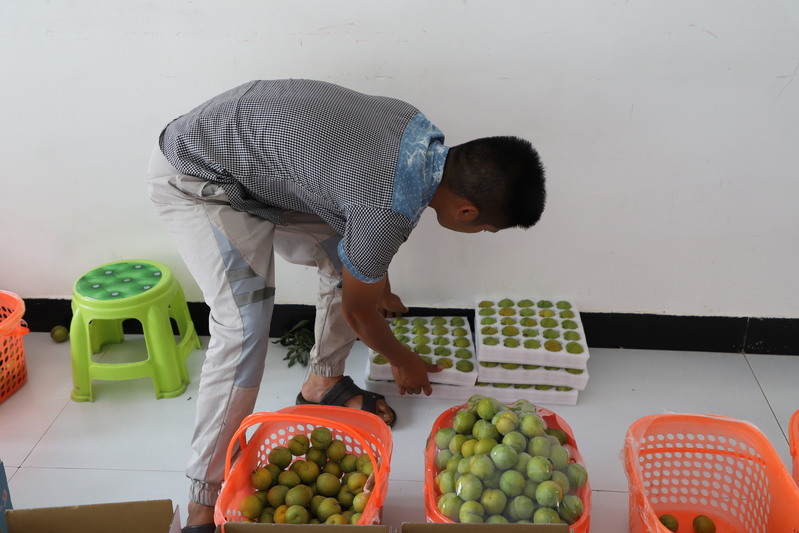 日前,记者来到镇宁自治县沙子乡弄染村种植户王坤的家中,他正在娴熟地打包蜂糖李,一箱箱打包完成的蜂糖李整齐叠放在一旁,随时等待发货。
