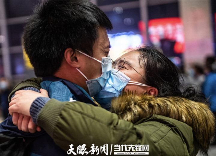 2020年2月11日晚,黄秀峰(左)作为贵州省第四批援鄂医疗队队员,在机场出发前与妻子章婷(右)“吻别”。陶亮 摄