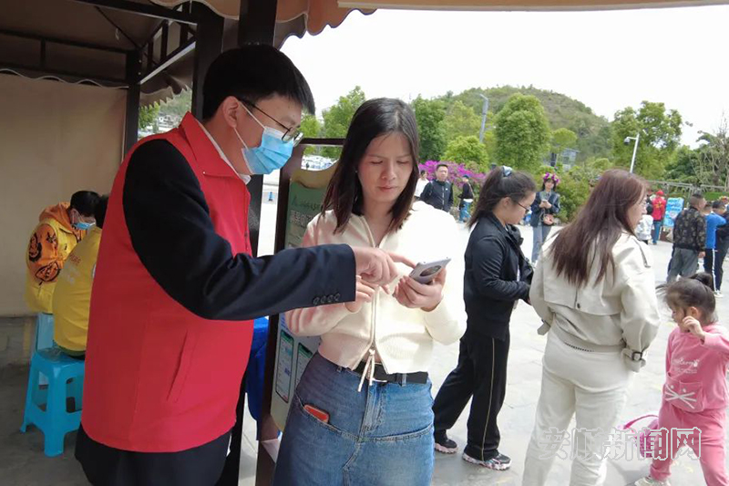 在大牌坊,游客正在志愿者的指导下,用手机预订景区门票和观光车票。据了解,黄果树景区门票实行网上预约、分时入园制度,游客可通过安旅通、一码游贵州等多平台预订,从早上7点到下午5点共分九个时段,全程刷脸入园,无需取票,实现快进慢游。