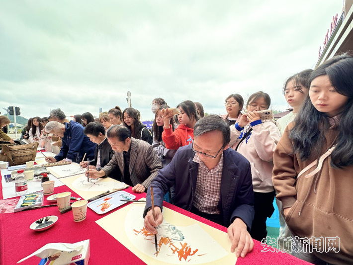 揭牌仪式之后,10余位嘉宾现场挥毫作画,或写意、或写实、或描绘花卉、或勾勒人物……来自安顺学院艺术学院的学生们现场观摩作画,与作画嘉宾交流学习绘画技巧和心得。(张羽)