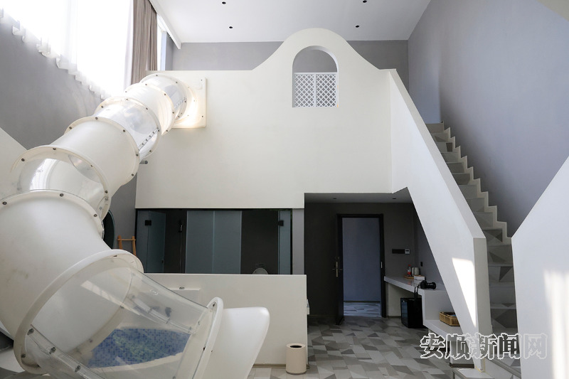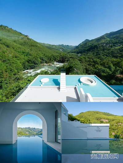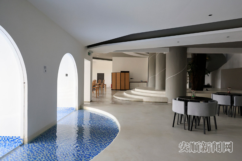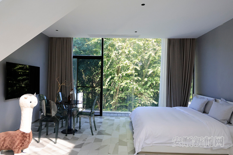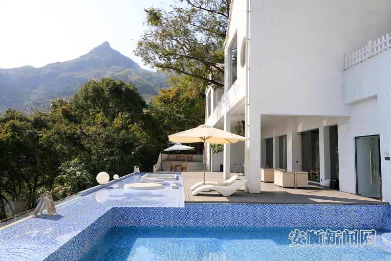 “考虑到民宿位于景区内,民宿外观主要以白色、蓝色为主色调,既能融于周围山景,又可以醒目吸睛。在室内设计上,我们采用了极简西班牙微水泥风格,同时在旋转楼梯、弧形吊顶等公共区域融入几何线条运用,整个民宿简单却又不失雅致。”山月集·黄果树民宿店长张曦瑶介绍道,民宿由贵州山月集酒店管理有限公司打造,总投资约2000万元,占地面积约5000平方米,于2022年7月开工建设,今年4月正式营业。目前民宿共有26个风格各异的房间,配有茶室、餐厅、无边泳池、休闲书吧、玻璃阶梯等公共功能区,游客们可以在这里诗意栖居,感受大自然的慰藉。