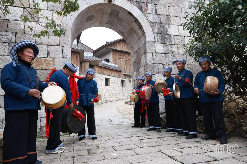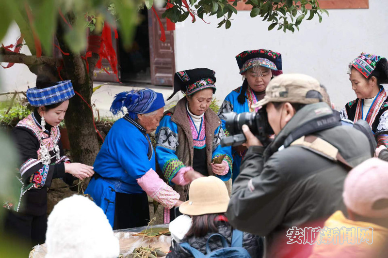 活动现场,身着布依族服饰的村民吹着唢呐,打着铜鼓,以浓重的民族仪式迎接客人的到来。随后,打糍粑吸引了广大游客的目光,两个村民各拿着一根圆木棒,舂打着石臼里的糯米饭。清香的糯米饭,雪白的糍粑,火热的氛围,让游客们感受到了浓浓的民俗文化氛围。他们拿着手中的相机,纷纷记录下这一热闹的瞬间。